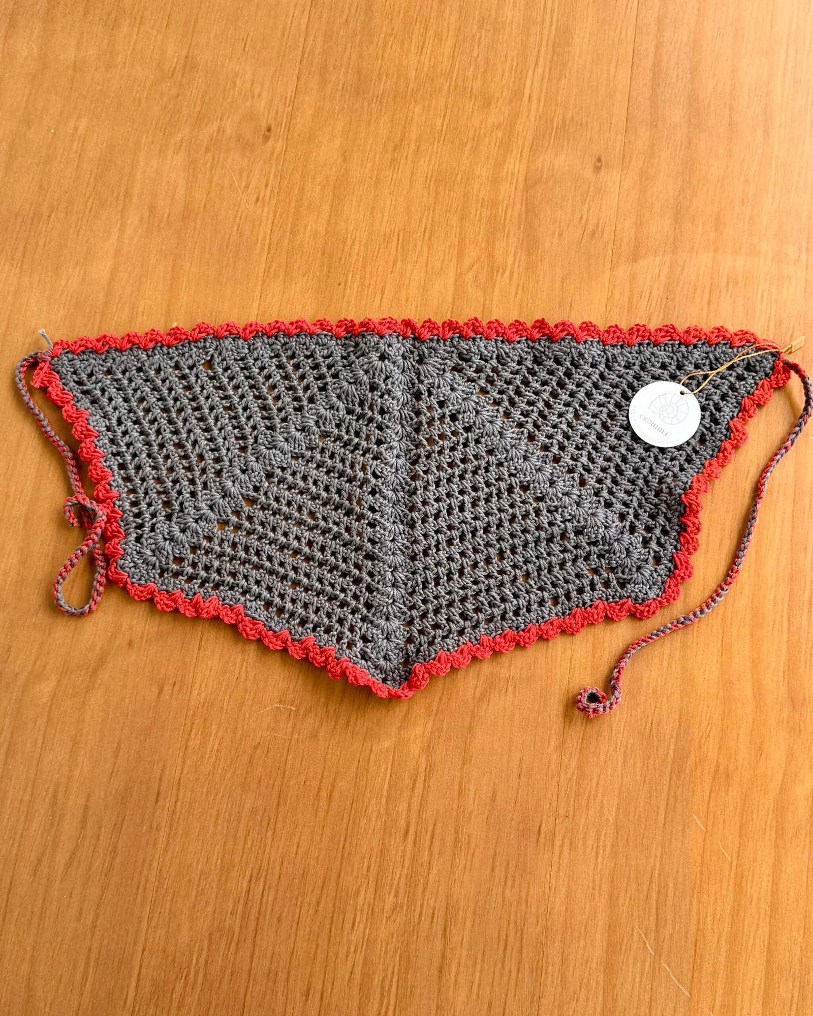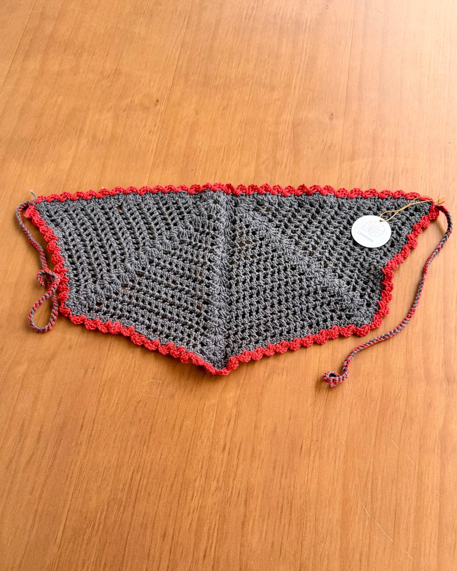 Lenço/bandana em crochê feito à mão na cor vermelho e cinza. Confeccionado com fio de alta qualidade, possui amarração ajustável e trama confortável, mesclando pontos fechados e abertos para um visual moderno. Ideal para usar como acessório de cabelo, no pescoço ou como detalhe estiloso em looks de verão.