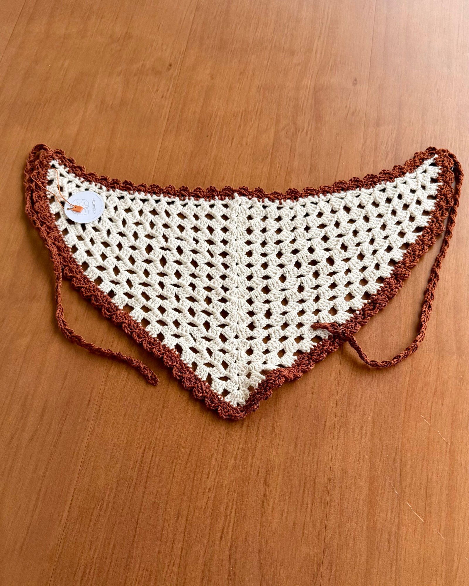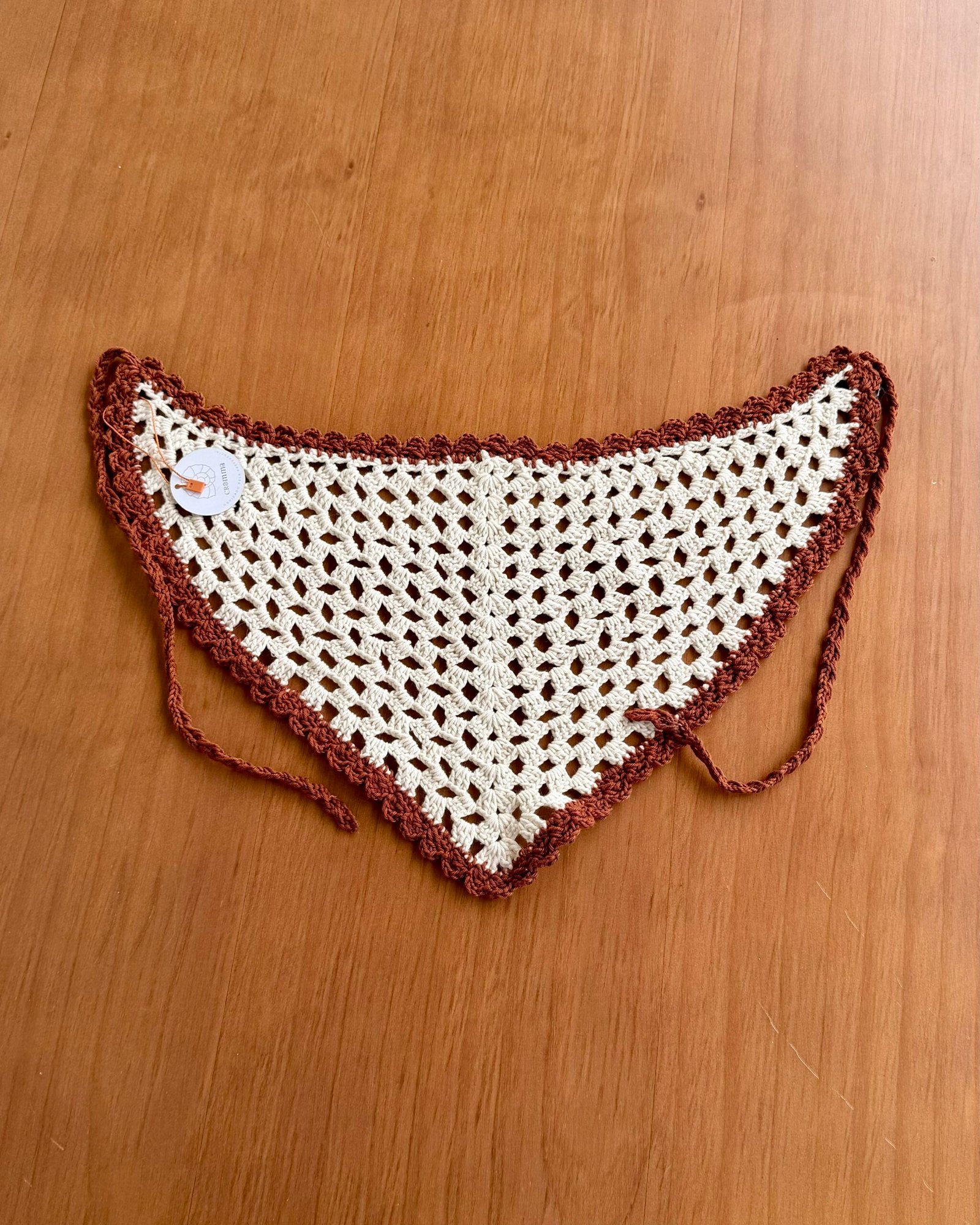 Lenço/bandana em crochê feito à mão na cores cru e marrom. Confeccionado com fio de alta qualidade, possui amarração ajustável e trama confortável, mesclando pontos fechados e abertos para um visual moderno. Ideal para usar como acessório de cabelo, no pescoço ou como detalhe estiloso em looks de verão.